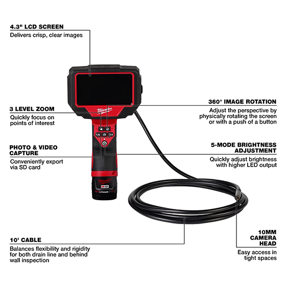 Our M12™ M-Spector™ 360 10' Inspection Camera​ Kit delivers clearer images for easier inspections. The 4.3" LCD screen with 720p camera provides crisp, clear images. The 10mm camera head allows for easy access while the cable balances flexibility and rigidity for both drain line and behind wall inspections. Conveniently share photos and videos via SD card. The M-Spector™ 360 features 360° image rotation for easy adjustment by physically rotating the screen or with a push of a button. Quickly focus on points of interest with 3 levels of zoom. This inspection camera also includes a 5-mode brightness adjustment to change the LED output.
